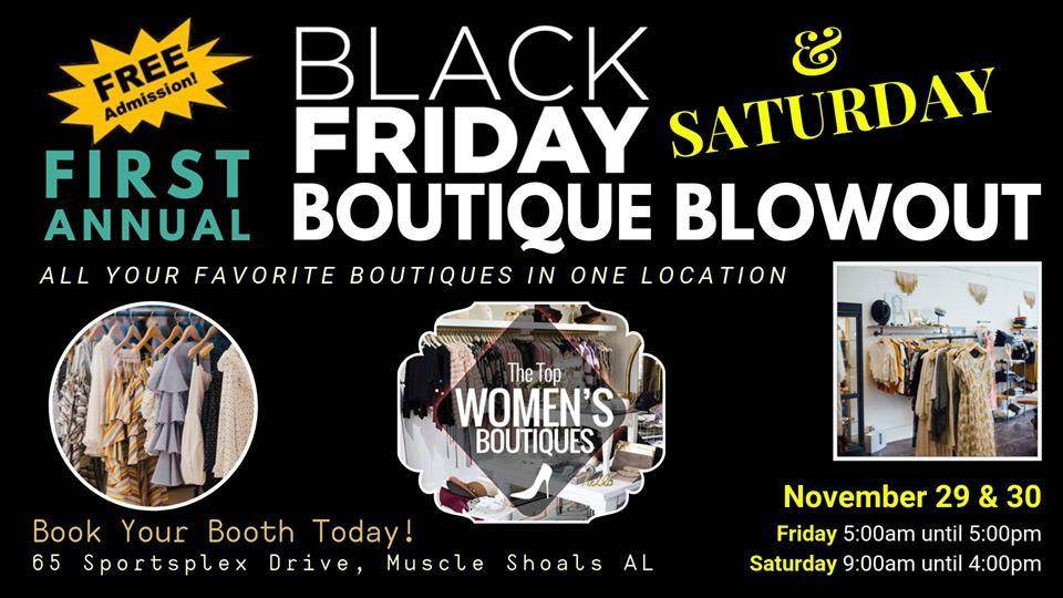 It's our First Annual Black Friday Boutique Blowout November 29-30. Shop all your favorite Boutiques in one location. Book your booth today and don't miss this exciting event. Free Admission & Parking