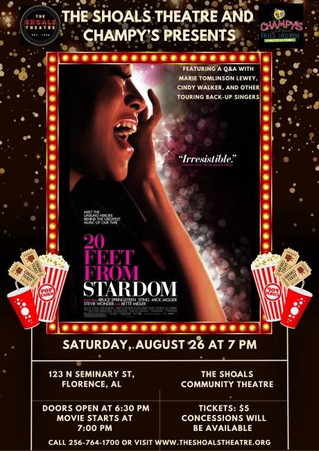 Champy's and the Shoals Theatre present "20 Feet From Stardom"......August 26, 7 p.m...... a documentary on back-up singers with Q & A session featuring Marie Tomlinson Lewey, Cindy Walker, and special guests.... tickets are $5 each and all seats are general admission.