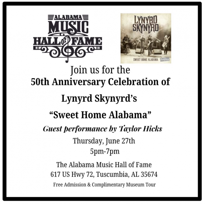 Join them on June 27th at 5pm for a special celebration of Lynyrd Skynyrd's famous and beloved hit song, "Sweet Home Alabama." This is a FREE event with guest star, Taylor Hicks! Sure to be a highly memorable night, you won't want to miss it.