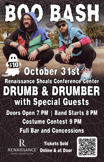 Are you looking for Halloween plans? Join us at the Renaissance Shoals Resort & Spa for a Halloween Boo Bash concert featuring Drumb and Drumber. The doors will open at 7:00pm with bars and concessions ready, and the band kicks off at 8:00pm. There will be a Halloween costume contest at 9:00pm and the most creative outfits will receive a prize. Grab your ghoulish crew, dress in your best spooky (or silly) costume, and dance the night away at the Halloween party of the year! Thank you to our sponsors: Pickett Place, Pickett on Court and Grogan’s by Lon.