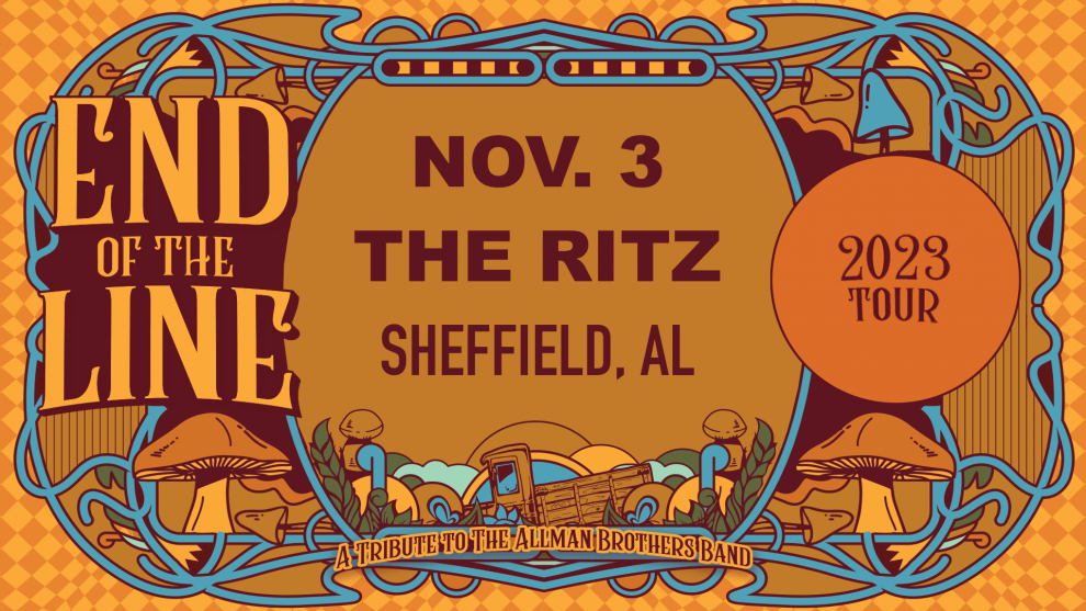 END OF THE LINE IS THE PREMIERE ALLMAN BROTHERS TRIBUTE BAND. HAVINGCARVED UP THE SOUTHEAST WITH SOLD OUT SHOWS IN GEORGIA & TENNESSEE, END OF THE LINE IS MAKING A NAME FOR THEMSELVES WITH A SOUND AS CLASSIC & HEAVY AS THE ORIGINAL BROTHERS THEMSELVES. FROM THE AUTHENTIC, RASPY VOCAL APPROACH OF JUSTIN SMITH TO THE CHUGGING DRUM/PERCUSSION TRAIN OF CHASE BADER, DAVE CZUBA, AND RYAN MCCLANAHAN, THE BAND BOTH PAYS HOMAGE WHILE PUSHING THE BOUNDARIES OF THE TIMELESS & EXTENSIVE CATALOG.