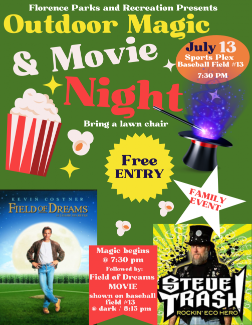 The Florence Parks and Recreation will present Outdoor Magic and Movie Night on July 13 at the Sports Plex Baseball Field No. 13, Sportsplex Drive, Florence. Magic with Steve Trash begins at 7:30 p.m., with "Field of Dreams" at dark (8:30 p.m.). Bring a lawn chair. Free entry.