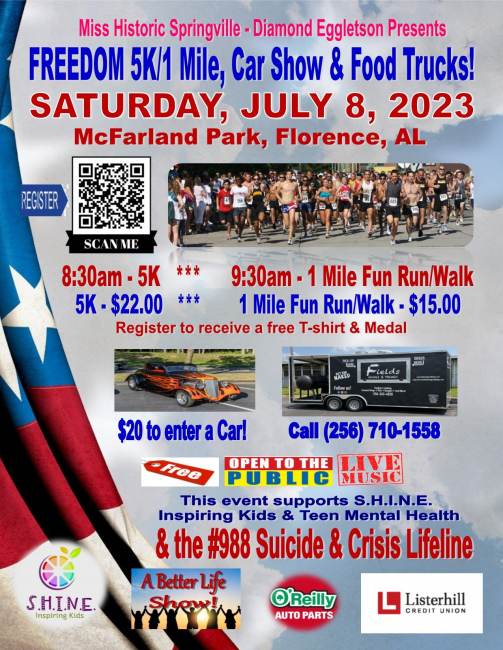 Individuals from all over the south will run in this year's race. Proceeds will support S.H.I.N.E. Inspiring Kids & Teen Mental Health, A Better Life Programs and other various community projects. Plus #988 Suicidal Crisis Life Line.