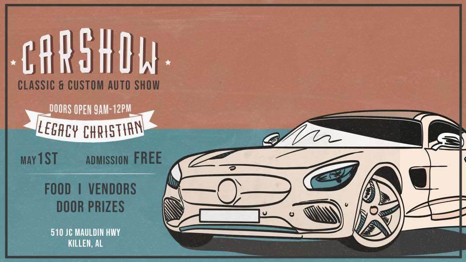 Come on out to a car show May 1st at Legacy Christian Academy (First Baptist Church Killen). Free admission, $25 to show your car. Prizes, vendors, coffee, food!