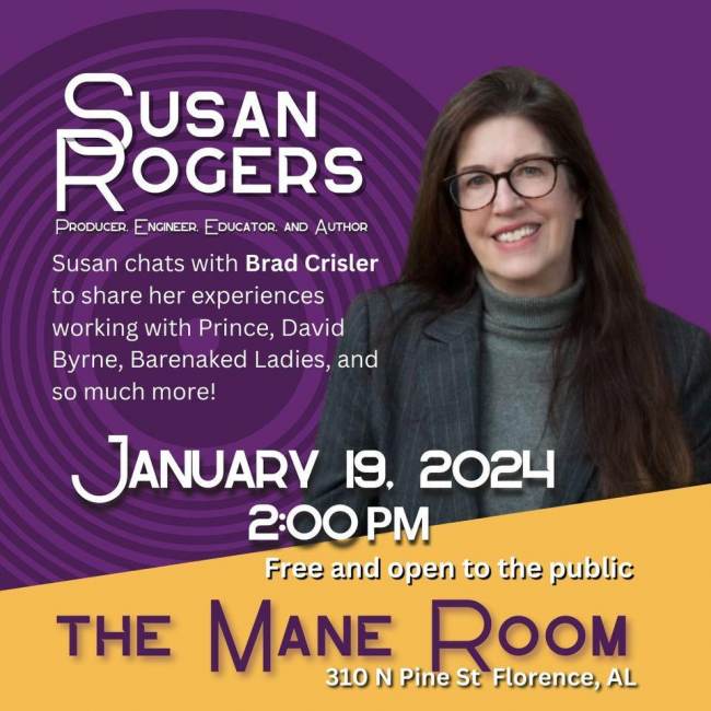 Susan rogers, legendary producer and engineer that worked on many of Prince's most legendary music will be speaking with Muscle Shoals music industry award wining songwriter and historian Brad Crisler.