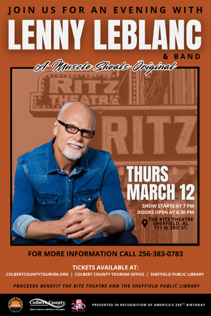 Don't miss your chance to hear a Muscle Shoals original, Lenny LeBlanc and band performing at the beautiful Ritz Theatre in downtown Sheffield! Proceeds benefit The Ritz Theatre and the Sheffield Public Library.