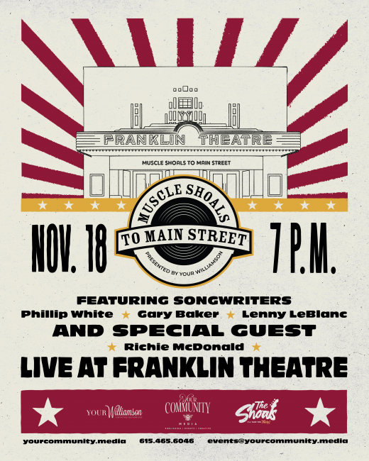 Award-winning songwriters and performers will travel from Muscle Shoals to Main Street, at the historic Franklin Theatre, for a night of music, memories and stories.