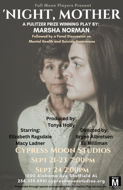The Full Moon Players and Cypress Moon Studios Presents “‘Night, Mother” September 21-24, 2023, from 7-10PM! Starring Elizabeth Ragsdale and Macy Ladner! Come see this influential Pulitzer Prize Winning Play by Marsha Norman followed by a panel discussion on mental health and suicide awareness. This show is produced by Tonya Holly, and directed by Brynn Albretsen and Eli Milliman.