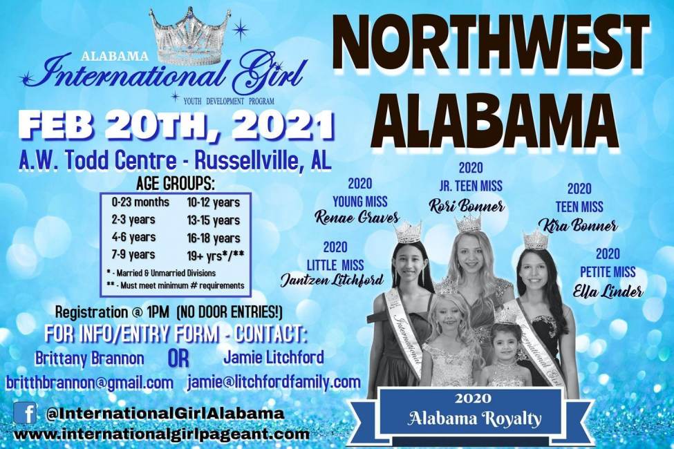 Alabama International Girl Northwest Preliminary. Compete in Interview, Casual Wear, Talent and Formal Wear. Bring your favorite H/M Vendor. Winners will advance to State in Mobile May 28 - 30, 2021