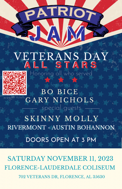 Join us at the Patriot Jam Veterans Day All Stars in November for a great event. Featuring Bo Bice and Gary Nichols. With special guests Skinny Molly and Rivermont - Austin Bohannon. The Patriot Jam Veterans Day All Stars works hard to deliver you a memorable event experience. We would love to hear from you, so consider writing us a review or contact us at: info@rodeoroadshow.org
