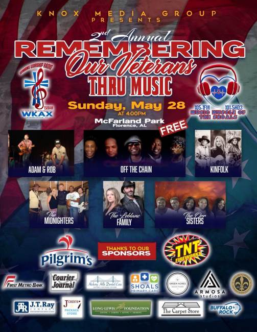 This Memorial Day, join Knox Media Group Inc in honoring our heroes who have served our country with pride and sacrifice. Tune in to 105.1 FM “Music Muscle of the Shoals” and WKAX 1500AM and listen to our tribute to our veterans. Our 2nd Annual Remembering Our Veterans event on May 28th at 4pm in McFarland Park is a testament to the bravery and selflessness of our servicemen and women. Let's give them the recognition they deserve and show our support for their service. Don't miss this opportunity to pay homage to our heroes. Join us in this celebration of patriotism and gratitude.