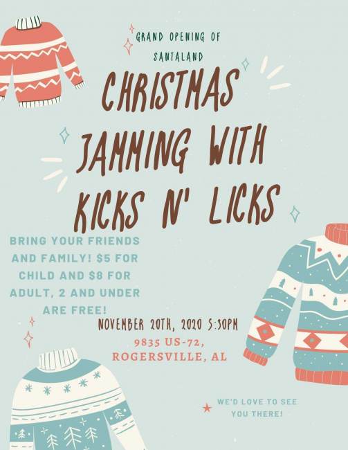 Come out to the grand opening of Santa Land! Fees to get in will be going to charity. Kicks n' Licks will be providing some live Christmas jams while you enjoy the Christmas themed wonderland!