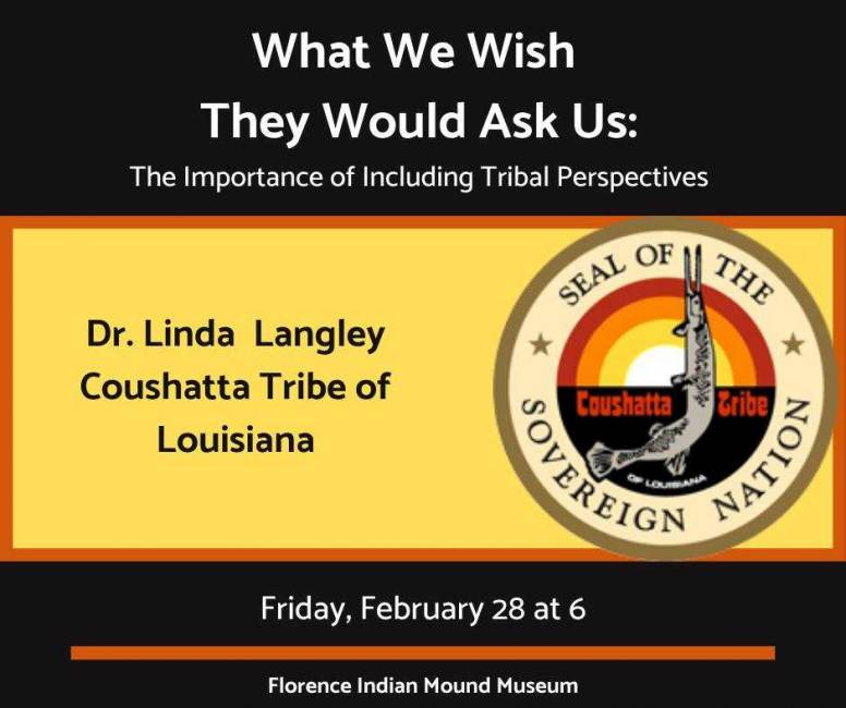 Dr. Linda Langley of the Coushatta Tribe of Louisiana will deliver her presentation, “What We Wish They Would Ask Us: The Importance of Including Tribal Perspectives” at the Florence Indian Mound Museum on Friday, February 28th, 2020 at 6 pm. Dr. Linda Langley serves the Tribal Historic Preservation Officer for the Coushatta Tribe and holds a Ph.D. in Anthropology from Brown University, and a BA in Archaeology from Harvard University. In addition to serving as Coushatta THPO, she is a Research Professor of Anthropology at McNeese State University in Lake Charles, Louisiana, and a Fellow in the Society for Applied Anthropology. Dr. Langley is the author of over forty-five articles, books, and videotapes spanning various areas of her work and research.
