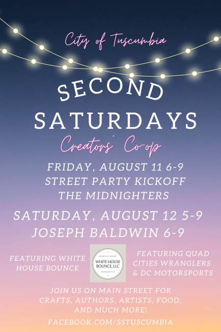 Second Saturdays in Tuscumbia is one you don't want to miss! Featuring amazing musical performances by The Midnighters and Joseph Baldwin as well as special appearances by Quad City Wranglers, DC Motorsports, and White House Bounce, this is going to be an amazing event! Join us on August 11th & 12th in Downtown Tuscumbia!