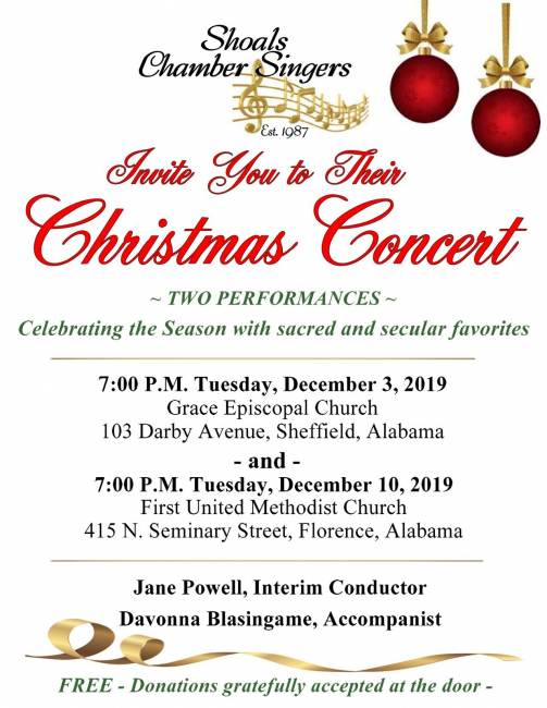 The Shoals Chamber Singers will offer two performances of its Christmas concert: the first at 7 p.m. on Tuesday, Dec. 3, at Grace Episcopal Church, 103 Darby Ave., Sheffield, and again at 7 p.m. on Tuesday, Dec. 10, at Florence First United Methodist Church, 415 N. Seminary St., Florence. Both performances are free to the public, with donations being accepted at the door.