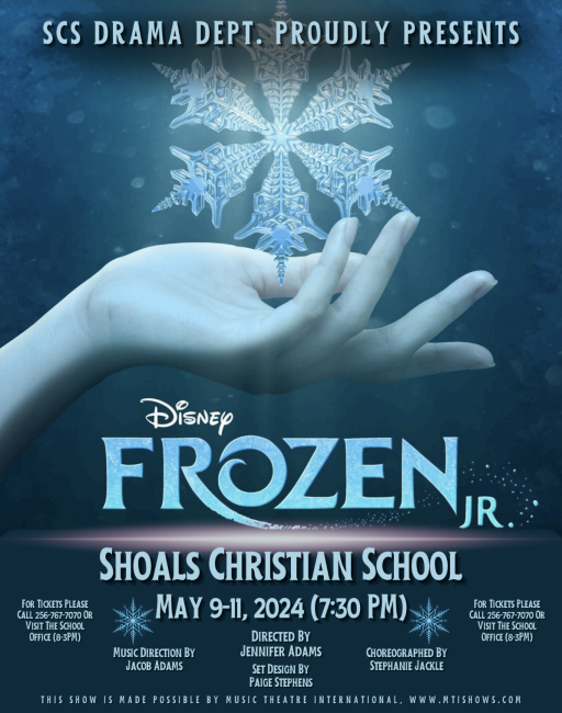 Shoals Christian School Drama Department presents Disney's Frozen Jr. Thursday, May 9, 2024 at 7:30pm, Friday, May 10, 2024 at 7:30pm and Saturday, May 11, 2024 at 7:30pm.