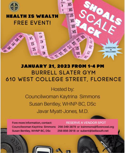 On January 21, 2023, from 1-4 pm in the Burrell Slater Gym we will unite for Shoals Scale Back! This will be a gathering of the entire Shoals community with the purpose of giving people the basics of knowledge about obesity.