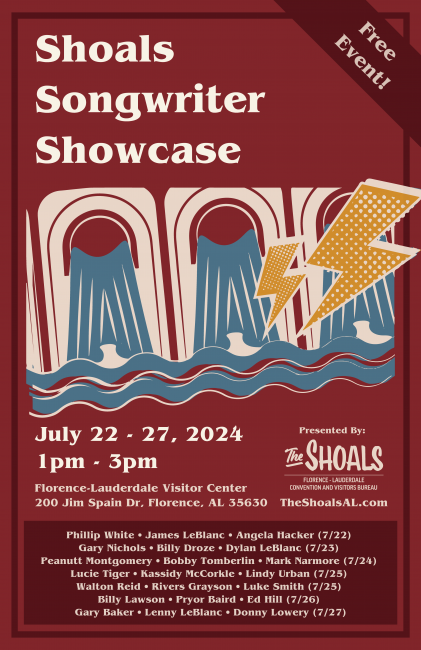 The Florence-Lauderdale Convention & Visitors Bureau will host the Shoals Songwriter Showcase during the week of July 22nd. Some of the top, hit songwriters in The Shoals, including Lenny LeBlanc, Gary Baker, James LeBlanc, Phillip White, Mark Narmore, Donny Lowery and many more, will share their stories and songs.