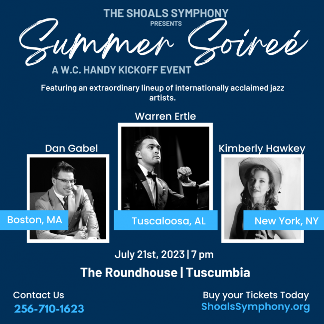 Celebrate the end of our 40th season on a perfect summer evening at the Shoals Symphony Summer Soireé. Enjoy chamber music, authentic Dixie-Land Jazz, and the world premiere of Warren Ertle's Handy Suite. Appetizers and drinks included.