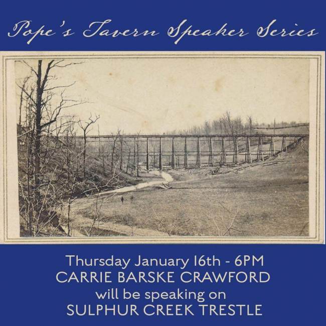 On January 16th, 2019 at 6pm, Dr. Carrie Barske Crawford, director of the Muscle Shoals National Heritage Area, will give a presentation on her work with the Sulphur Creek Trestle Preservation Project in Limestone County, Alabama. The Battle of Sulphur Creek Trestle, which took place during the Civil War in September 1864, was centered around a bridge on the Alabama and Tennessee Railroad.
