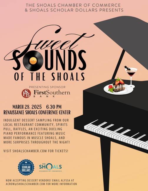 The Shoals Chamber of Commerce and Shoals Scholar Dollars will team up in March for the inaugural Sweet Sounds of the Shoals event. Sweet Sounds of the Shoals will be an evening event including an indulgent sampling of desserts from our local restaurant and cafe community, a signature cocktail crafted just for the occasion, and a coffee bar. As you savor these sweet treats, enjoy live entertainment, including an exciting dueling piano performance featuring music made famous in Muscle Shoals and more surprises throughout the night. Restaurants will compete for 1st, 2nd, and 3rd place for the Best Dessert in the Shoals!
