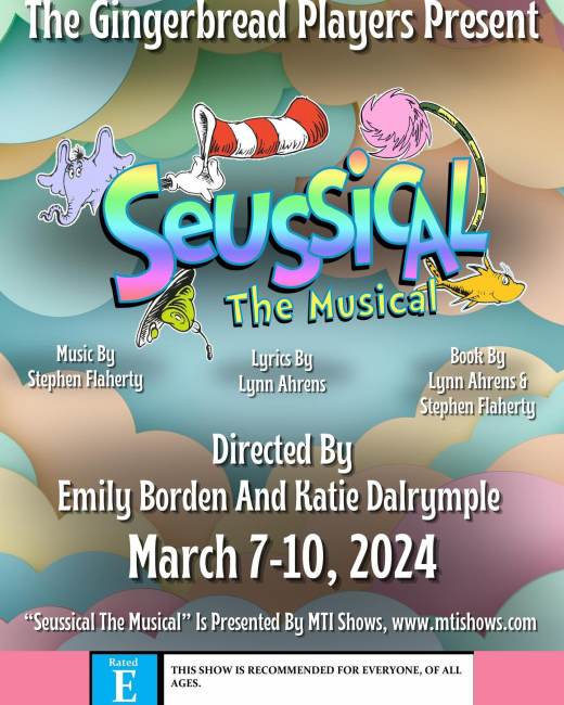 “Oh the things you can think!” This March the beloved Dr. Seuss stories we all know and love come to life once again LIVE onstage at The Shoals Theatre! The Gingerbread Players Proudly Present, “Seussical: The Musical”! This fun-filled show is directed by Emily Borden and Katie Dalrymple, choreographed by Lisa Valentine, and music directed by Savannah Phillips! Show dates are March 7-10!Now one of the most performed shows in America, Seussical is a fantastical, magical, musical extravaganza! Tony winners, Lynn Ahrens and Stephen Flaherty (Lucky Stiff, My Favorite Year, Once on This Island, Ragtime), have lovingly brought to life all of our favorite Dr. Seuss characters, including Horton the Elephant, The Cat in the Hat, Gertrude McFuzz, lazy Mayzie and a little boy with a big imagination – Jojo. The colorful characters transport us from the Jungle of Nool to the Circus McGurkus to the invisible world of the Whos. The Cat in the Hat tells the story of Horton, an elephant who discovers a speck of dust that contains the Whos, including Jojo, a Who child sent off to military school for thinking too many “thinks.” Horton faces a double challenge: not only must he protect the Whos from a world of naysayers and dangers, but he must guard an abandoned egg, left in his care by the irresponsible Mayzie La Bird. Although Horton faces ridicule, danger, kidnapping and a trial, the intrepid Gertrude McFuzz never loses faith in him. Ultimately, the powers of friendship, loyalty, family and community are challenged and emerge triumphant. Seussical is fun for the whole family!