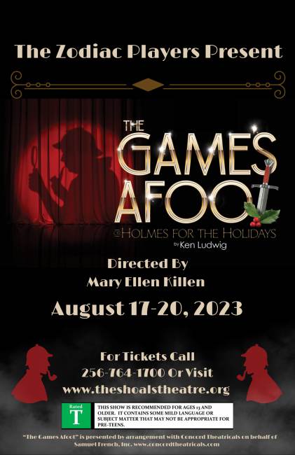 The Games are definitely afoot here at The Shoals Theatre, and mystery lurks at every corner. Join The Zodiac Players and The Shoals Community Theatre as they proudly present Ken Ludwig’s “The Games Afoot” THIS WEEKEND August 17-20!