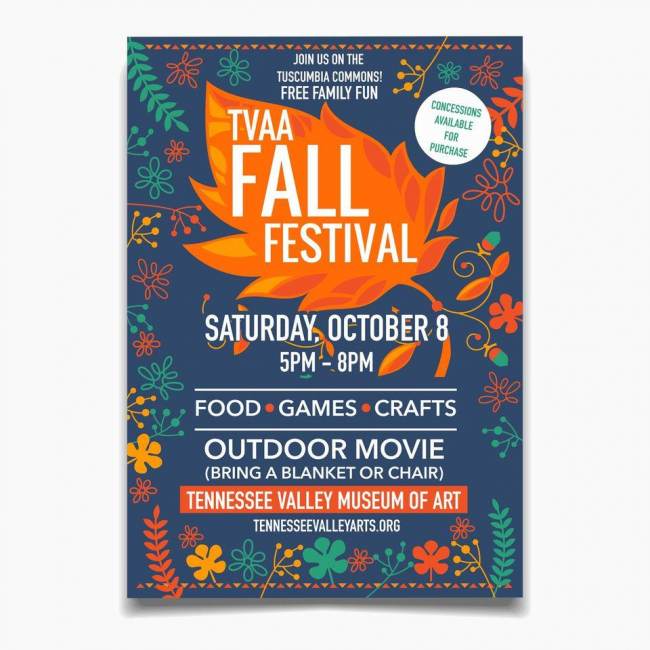 Join us for some free family fun! We'll be having an outdoor TVAA Fall Festival on Saturday, October 8, from 5-8 pm. Bring the whole family to the Tuscumbia Commons (in front of the Tennessee Valley Museum of Art) for food, games, crafts, and an outdoor movie. Be sure to bring a blanket or chair! Concessions will be available to purchase.