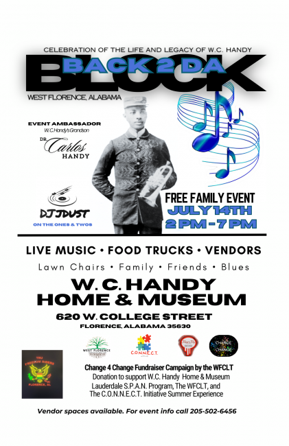 Join us in celebrating the life and legacy of W.C. Handy with the West Florence Community at the unforgettable "Back 2 Da Block" party! This exciting, family-friendly event at the W.C. Handy Home and Museum promises a day filled with delicious food, vibrant music, local vendors, and entertainment for all ages. Bring your blankets, lawn chairs, and enthusiasm to support this highly anticipated celebration! Your participation helps fund the W.C. Handy Home and Museum and the Lauderdale County SPAN Program. Don't miss out on this amazing opportunity to honor a musical legend and uplift our community!