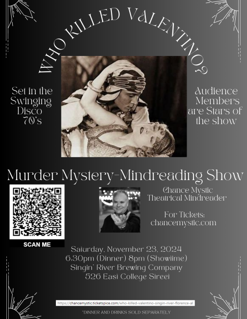 The Murder Mystery "Who Killed Valentino" is a fun audience participation classic Murder Mystery, where the audience members are the stars in this hilarious drama. Your friends and loved ones will surprise everyone as they are transformed into jealous, treacherous characters, unleashing their hilarious murderous side. The imaginations of the audience are captured as your host Chance Mystic, "The World's Greatest Mindreader", reveals deep secrets with no way of knowing. Set in the Groovy 70's, this fun and surprising murder mystery is unlike anything you’ve ever experienced. This experience will be talked about for years to come. Come be a part of "Who Killed Valentino".