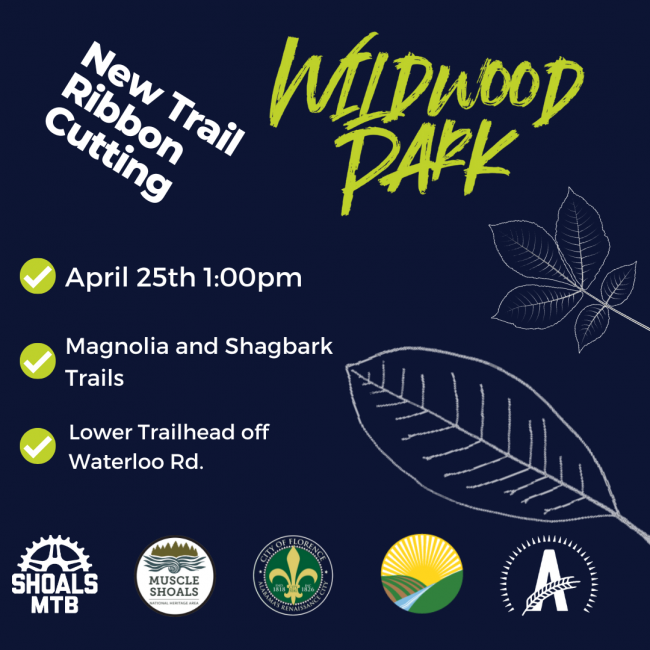The City of Florence and the Shoals MTB non-profit are hosting a ribbon cutting ceremony for the NEW multi-use trails at Wildwood Park. The event will take place at the trailhead near the Cypress Creek bridge on Waterloo Road. Starting at 1:00pm This trail project has been funded by the Northwest Alabama RC&D council, Athletic Brewing co, the Joel R. Anderson Family Foundation, and with locally matched funds from Shimano through the IMBA Dig In program. The Master Plan for the Trails in Wildwood Park was provided to the city by the Muscle Shoals National Heritage Area (MSNHA). The Shoals MTB non-profit, a chapter of the Southern Off Road Bicycle Association (SORBA), has been fundraising and leading volunteer efforts to maintain and develop new recreational opportunities in the park since 2018. The Shoals MTB organization strives to make Wildwood Park an outdoor recreational destination for all users. The trails in the park have historically been very challenging for beginners, but this trail project will provide an example of the modern trail design that creates equity and inclusion. There will be another 2 miles of this type of trail developed in the coming year. This development has many sponsorship needs and opportunities. To learn more please email shoalsmtb@gmail.com